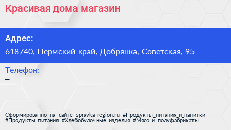 Красивая дома, магазин по адресу 618740, Пермский край, Добрянка, Советская, 95 в дальнейшем Организация, размещена в следующих категориях: