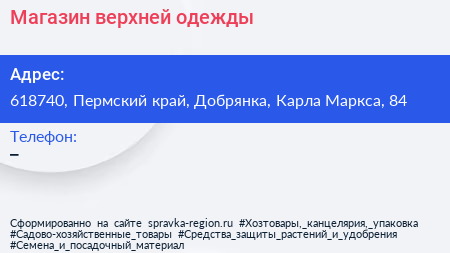Магазин верхней одежды по адресу 618740, Пермский край, Добрянка, Карла Маркса, 84 в дальнейшем Организация, размещена в следующих категориях: