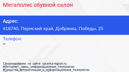 Мегаполис, обувной салон по адресу 618740, Пермский край, Добрянка, Победы, 25 в дальнейшем Организация, размещена в следующих категориях: