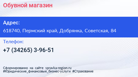 Обувной магазин по адресу 618740, Пермский край, Добрянка, Советская, 84 в дальнейшем Организация, размещена в следующих категориях: