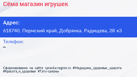 Сёма, магазин игрушек по адресу 618740, Пермский край, Добрянка, Радищева, 28 к3 в дальнейшем Организация, размещена в следующих категориях: