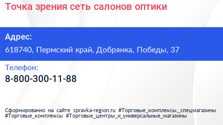Точка зрения, сеть салонов оптики по адресу 618740, Пермский край, Добрянка, Победы, 37 в дальнейшем Организация, размещена в следующих категориях: