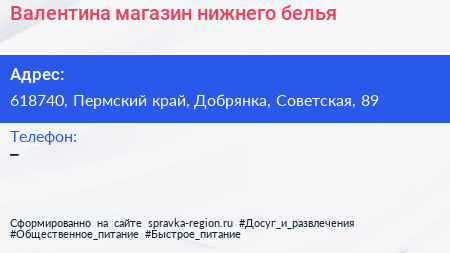 Валентина, магазин нижнего белья по адресу 618740, Пермский край, Добрянка, Советская, 89 в дальнейшем Организация, размещена в следующих категориях: