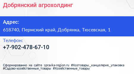 Добрянский, агрохолдинг по адресу 618740, Пермский край, Добрянка, Тюсевская, 1 в дальнейшем Организация, размещена в следующих категориях:
