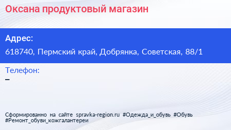 Оксана, продуктовый магазин по адресу 618740, Пермский край, Добрянка, Советская, 88/1 в дальнейшем Организация, размещена в следующих категориях: