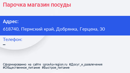 Парочка, магазин посуды по адресу 618740, Пермский край, Добрянка, Герцена, 30 в дальнейшем Организация, размещена в следующих категориях: