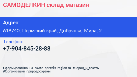 САМОДЕЛКИН, склад-магазин по адресу 618740, Пермский край, Добрянка, Мира, 2 в дальнейшем Организация, размещена в следующих категориях: