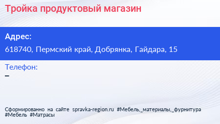 Тройка, продуктовый магазин по адресу 618740, Пермский край, Добрянка, Гайдара, 15 в дальнейшем Организация, размещена в следующих категориях: