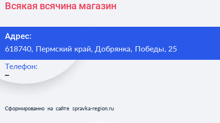 Всякая всячина, магазин по адресу 618740, Пермский край, Добрянка, Победы, 25 в дальнейшем Организация, размещена в следующих категориях: