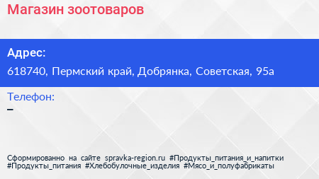 Магазин зоотоваров по адресу 618740, Пермский край, Добрянка, Советская, 95а в дальнейшем Организация, размещена в следующих категориях: