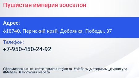 Пушистая империя, зоосалон по адресу 618740, Пермский край, Добрянка, Победы, 37 в дальнейшем Организация, размещена в следующих категориях: