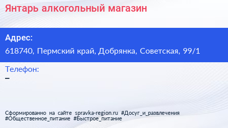 Янтарь, алкогольный магазин по адресу 618740, Пермский край, Добрянка, Советская, 99/1 в дальнейшем Организация, размещена в следующих категориях: