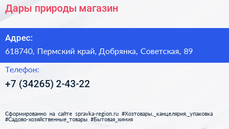 Дары природы, магазин по адресу 618740, Пермский край, Добрянка, Советская, 89 в дальнейшем Организация, размещена в следующих категориях: