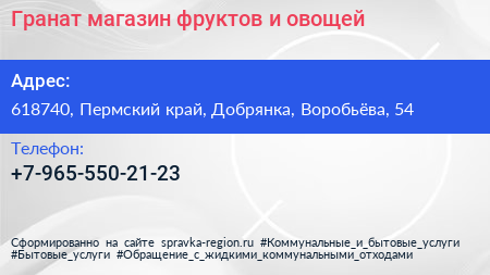 Гранат, магазин фруктов и овощей по адресу 618740, Пермский край, Добрянка, Воробьёва, 54 в дальнейшем Организация, размещена в следующих категориях: