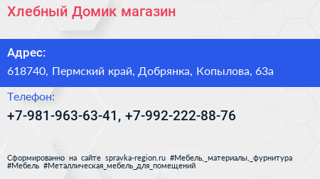 Хлебный Домик, магазин по адресу 618740, Пермский край, Добрянка, Копылова, 63а в дальнейшем Организация, размещена в следующих категориях: