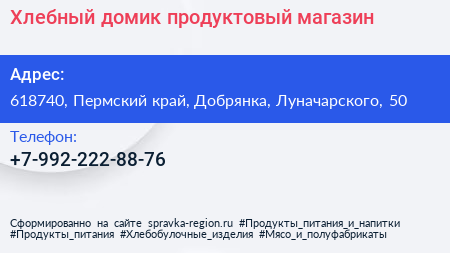 Хлебный домик, продуктовый магазин по адресу 618740, Пермский край, Добрянка, Луначарского, 50 в дальнейшем Организация, размещена в следующих категориях: