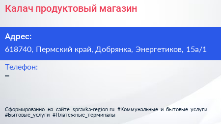 Калач, продуктовый магазин по адресу 618740, Пермский край, Добрянка, Энергетиков, 15а/1 в дальнейшем Организация, размещена в следующих категориях: