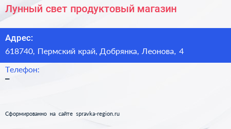 Лунный свет, продуктовый магазин по адресу 618740, Пермский край, Добрянка, Леонова, 4 в дальнейшем Организация, размещена в следующих категориях: