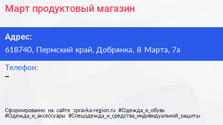 Март, продуктовый магазин по адресу 618740, Пермский край, Добрянка, 8 Марта, 7а в дальнейшем Организация, размещена в следующих категориях: