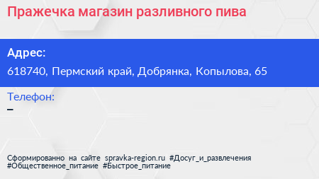 Пражечка, магазин разливного пива по адресу 618740, Пермский край, Добрянка, Копылова, 65 в дальнейшем Организация, размещена в следующих категориях:
