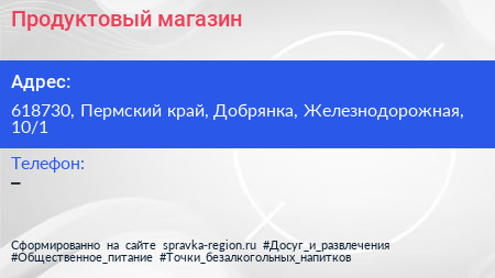 Продуктовый магазин по адресу 618730, Пермский край, Добрянка, Железнодорожная, 10/1 в дальнейшем Организация, размещена в следующих категориях: