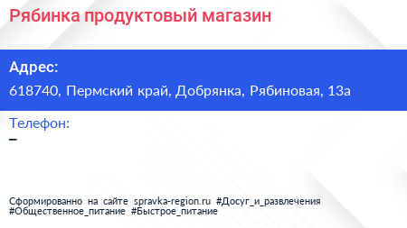 Рябинка, продуктовый магазин по адресу 618740, Пермский край, Добрянка, Рябиновая, 13а в дальнейшем Организация, размещена в следующих категориях: