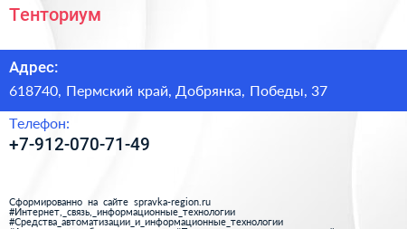 Тенториум по адресу 618740, Пермский край, Добрянка, Победы, 37 в дальнейшем Организация, размещена в следующих категориях: