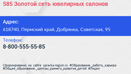 585 Золотой, сеть ювелирных салонов по адресу 618740, Пермский край, Добрянка, Советская, 95 в дальнейшем Организация, размещена в следующих категориях: