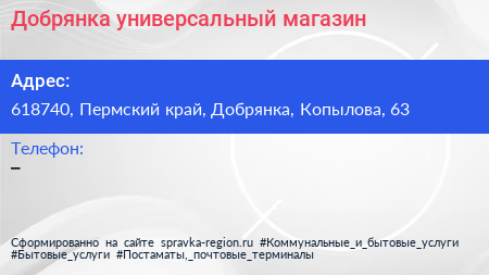 Добрянка, универсальный магазин по адресу 618740, Пермский край, Добрянка, Копылова, 63 в дальнейшем Организация, размещена в следующих категориях: