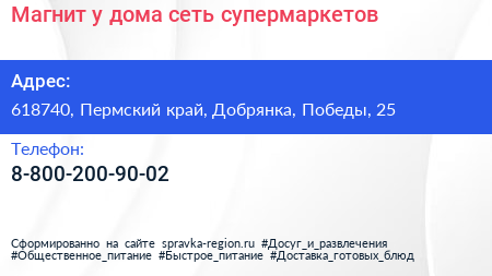 Магнит у дома, сеть супермаркетов по адресу 618740, Пермский край, Добрянка, Победы, 25 в дальнейшем Организация, размещена в следующих категориях: