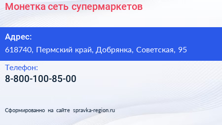Монетка, сеть супермаркетов по адресу 618740, Пермский край, Добрянка, Советская, 95 в дальнейшем Организация, размещена в следующих категориях: