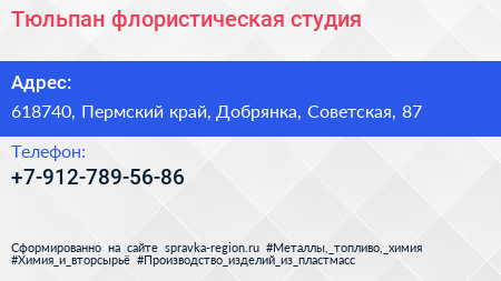 Тюльпан, флористическая студия по адресу 618740, Пермский край, Добрянка, Советская, 87 в дальнейшем Организация, размещена в следующих категориях: