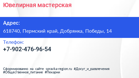 Ювелирная мастерская по адресу 618740, Пермский край, Добрянка, Победы, 14 в дальнейшем Организация, размещена в следующих категориях: