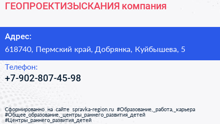 ГЕОПРОЕКТИЗЫСКАНИЯ, компания по адресу 618740, Пермский край, Добрянка, Куйбышева, 5 в дальнейшем Организация, размещена в следующих категориях: