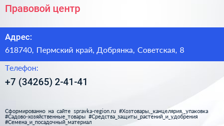 Правовой центр по адресу 618740, Пермский край, Добрянка, Советская, 8 в дальнейшем Организация, размещена в следующих категориях: