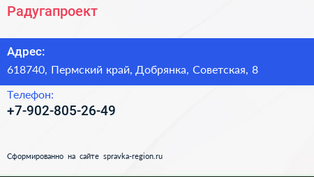 Радугапроект по адресу 618740, Пермский край, Добрянка, Советская, 8 в дальнейшем Организация, размещена в следующих категориях: