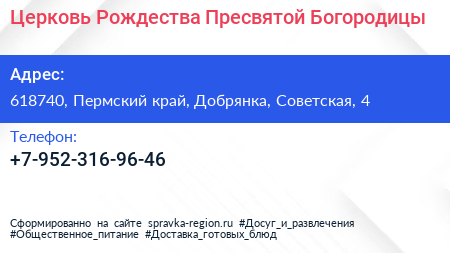 Церковь Рождества Пресвятой Богородицы по адресу 618740, Пермский край, Добрянка, Советская, 4 в дальнейшем Организация, размещена в следующих категориях: