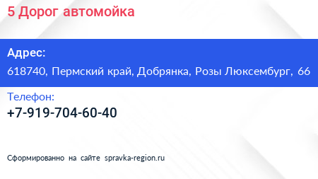 5 Дорог, автомойка по адресу 618740, Пермский край, Добрянка, Розы Люксембург, 66 в дальнейшем Организация, размещена в следующих категориях: