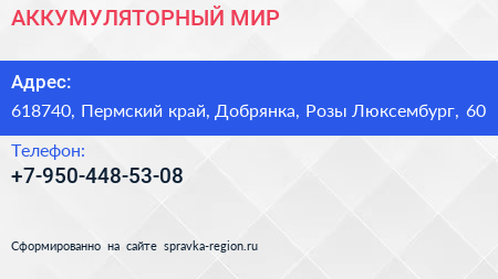 АККУМУЛЯТОРНЫЙ МИР по адресу 618740, Пермский край, Добрянка, Розы Люксембург, 60 в дальнейшем Организация, размещена в следующих категориях: