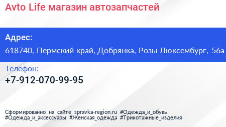 Avto Life, магазин автозапчастей по адресу 618740, Пермский край, Добрянка, Розы Люксембург, 56а в дальнейшем Организация, размещена в следующих категориях: