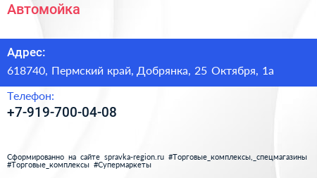 Автомойка по адресу 618740, Пермский край, Добрянка, 25 Октября, 1а в дальнейшем Организация, размещена в следующих категориях: