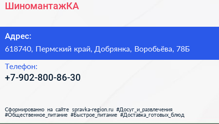 ШиномантажКА по адресу 618740, Пермский край, Добрянка, Воробьёва, 78Б в дальнейшем Организация, размещена в следующих категориях: