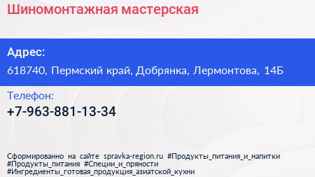 Шиномонтажная мастерская по адресу 618740, Пермский край, Добрянка, Лермонтова, 14Б в дальнейшем Организация, размещена в следующих категориях: