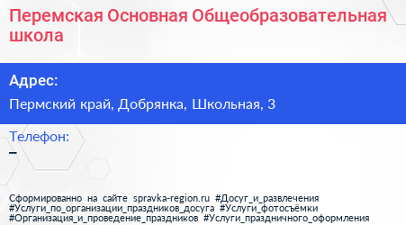Перемская Основная Общеобразовательная школа по адресу Пермский край, Добрянка, Школьная, 3 в дальнейшем Организация, размещена в следующих категориях: