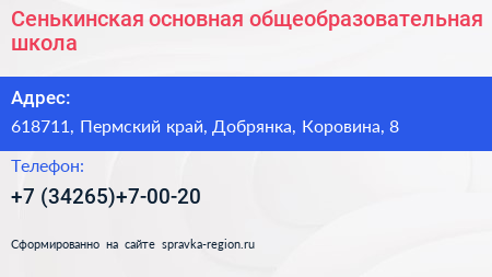 Сенькинская основная общеобразовательная школа по адресу 618711, Пермский край, Добрянка, Коровина, 8 в дальнейшем Организация, размещена в следующих категориях: