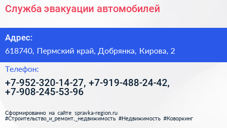 Служба эвакуации автомобилей по адресу 618740, Пермский край, Добрянка, Кирова, 2 в дальнейшем Организация, размещена в следующих категориях: