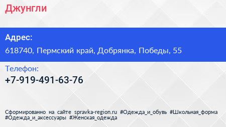 Джунгли по адресу 618740, Пермский край, Добрянка, Победы, 55 в дальнейшем Организация, размещена в следующих категориях:
