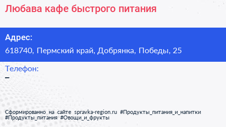 Любава, кафе быстрого питания по адресу 618740, Пермский край, Добрянка, Победы, 25 в дальнейшем Организация, размещена в следующих категориях: