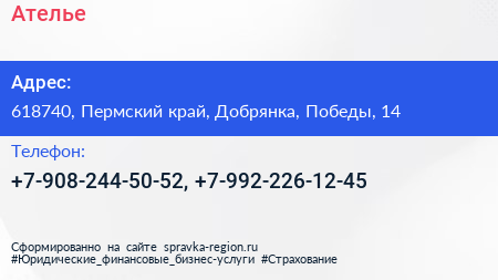 Ателье по адресу 618740, Пермский край, Добрянка, Победы, 14 в дальнейшем Организация, размещена в следующих категориях:
