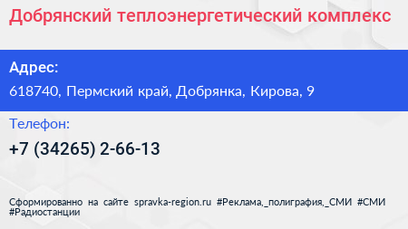 Добрянский теплоэнергетический комплекс по адресу 618740, Пермский край, Добрянка, Кирова, 9 в дальнейшем Организация, размещена в следующих категориях: